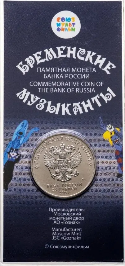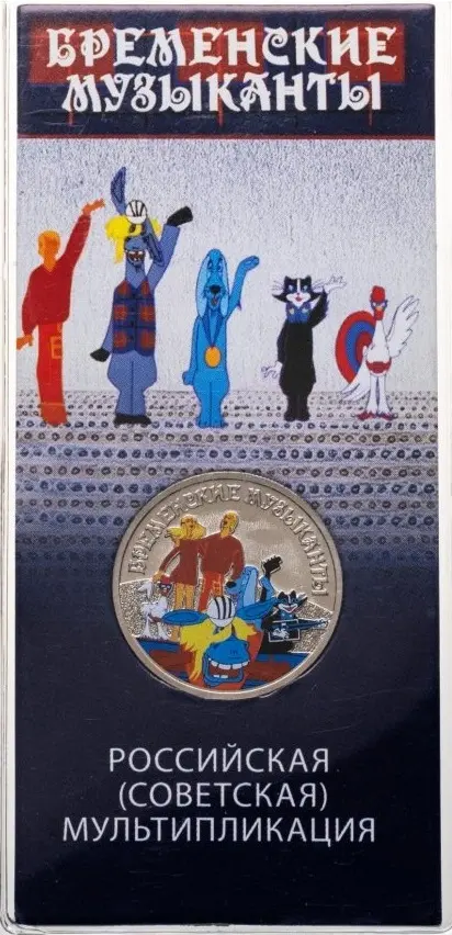 цветное изображение сцены из мультфильма; вверху вдоль канта – надпись: "БРЕМЕНСКИЕ МУЗЫКАНТЫ".