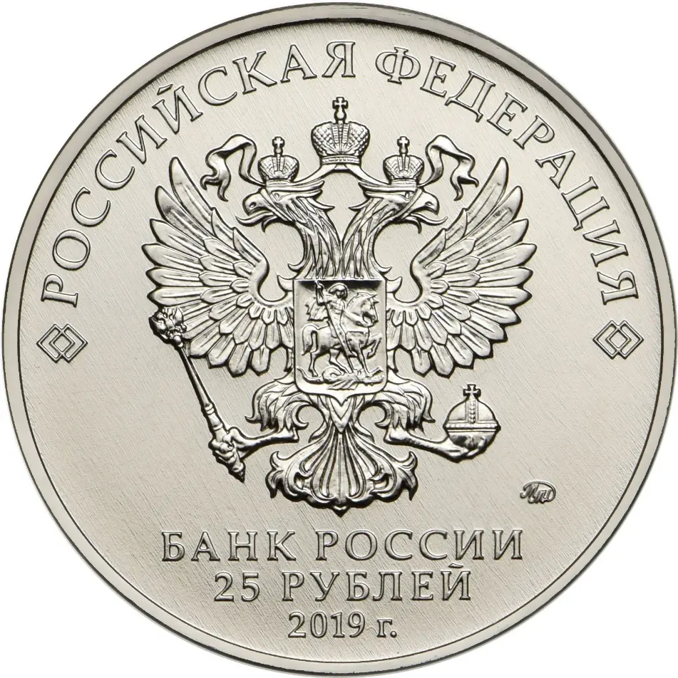 в центре – рельефное изображение Государственного герба Российской Федерации, над ним вдоль канта – надпись полукругом: "РОССИЙСКАЯ ФЕДЕРАЦИЯ", обрамленная с обеих сторон сдвоенными ромбами, под гербом в центре в три строки – надпись: "БАНК РОССИИ", номинал монеты: "25 РУБЛЕЙ", год выпуска: "2019 г.", справа – товарный знак монетного двора.