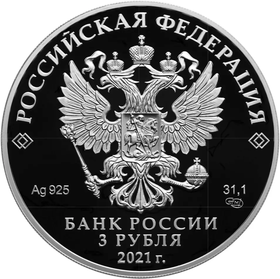 на зеркальном поле диска — рельефное изображение Государственного герба Российской Федерации, над ним вдоль канта — надпись полукругом: «РОССИЙСКАЯ ФЕДЕРАЦИЯ», обрамленная с обеих сторон сдвоенными ромбами, внизу под гербом: слева — обозначения драгоценного металла и пробы сплава, справа — содержание химически чистого металла и товарный знак монетного двора, внизу в центре в три строки — надпись: «БАНК РОССИИ», номинал монеты: «3 РУБЛЯ», год выпуска: «2021 г.».