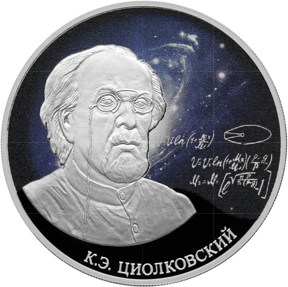 на зеркальном поле диска — рельефное изображение портрета К.Э. Циолковского на фоне выполненных в цвете изображений космического пространства и формул; внизу вдоль канта — надпись: «К.Э. ЦИОЛКОВСКИЙ».