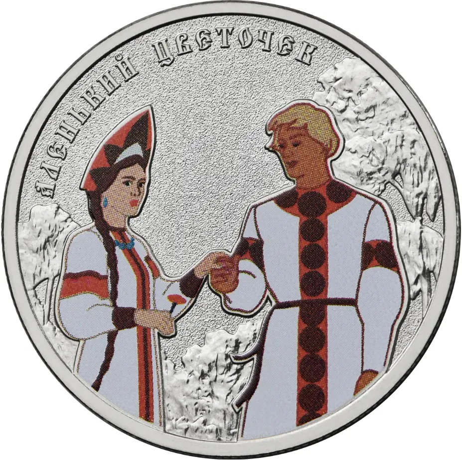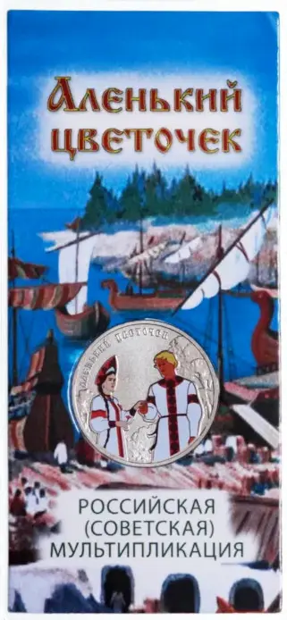 выполненное в рельефе и цвете изображение сцены из мультфильма «Аленький цветочек»; вверху слева по окружности – рельефная надпись «АЛЕНЬКИЙ ЦВЕТОЧЕК».