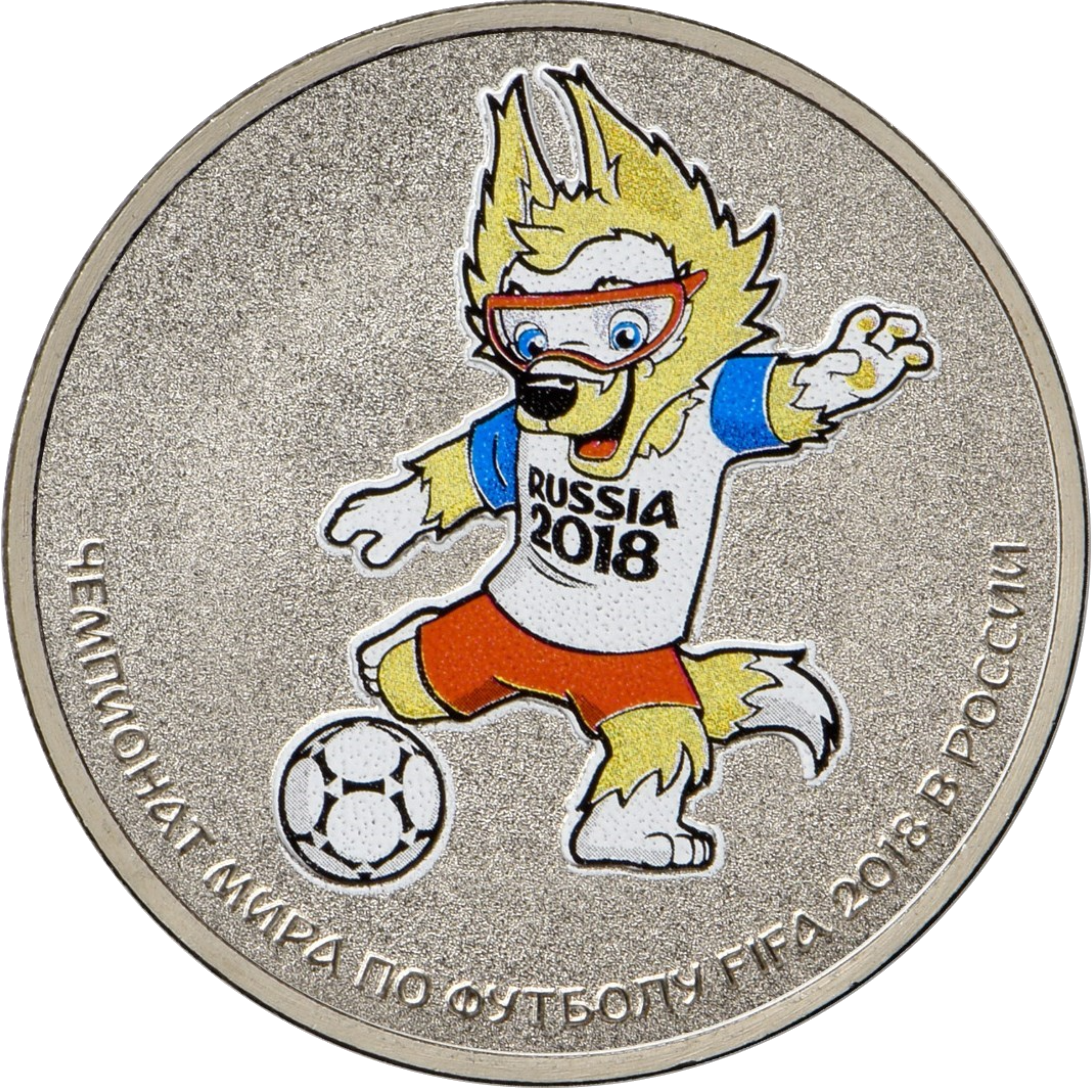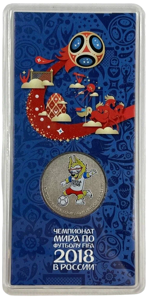 выполненное в цвете изображение талисмана Чемпионата мира по футболу FIFA 2018 в России; внизу по окружности – надпись: "ЧЕМПИОНАТ МИРА ПО ФУТБОЛУ FIFA 2018 В РОССИИ".