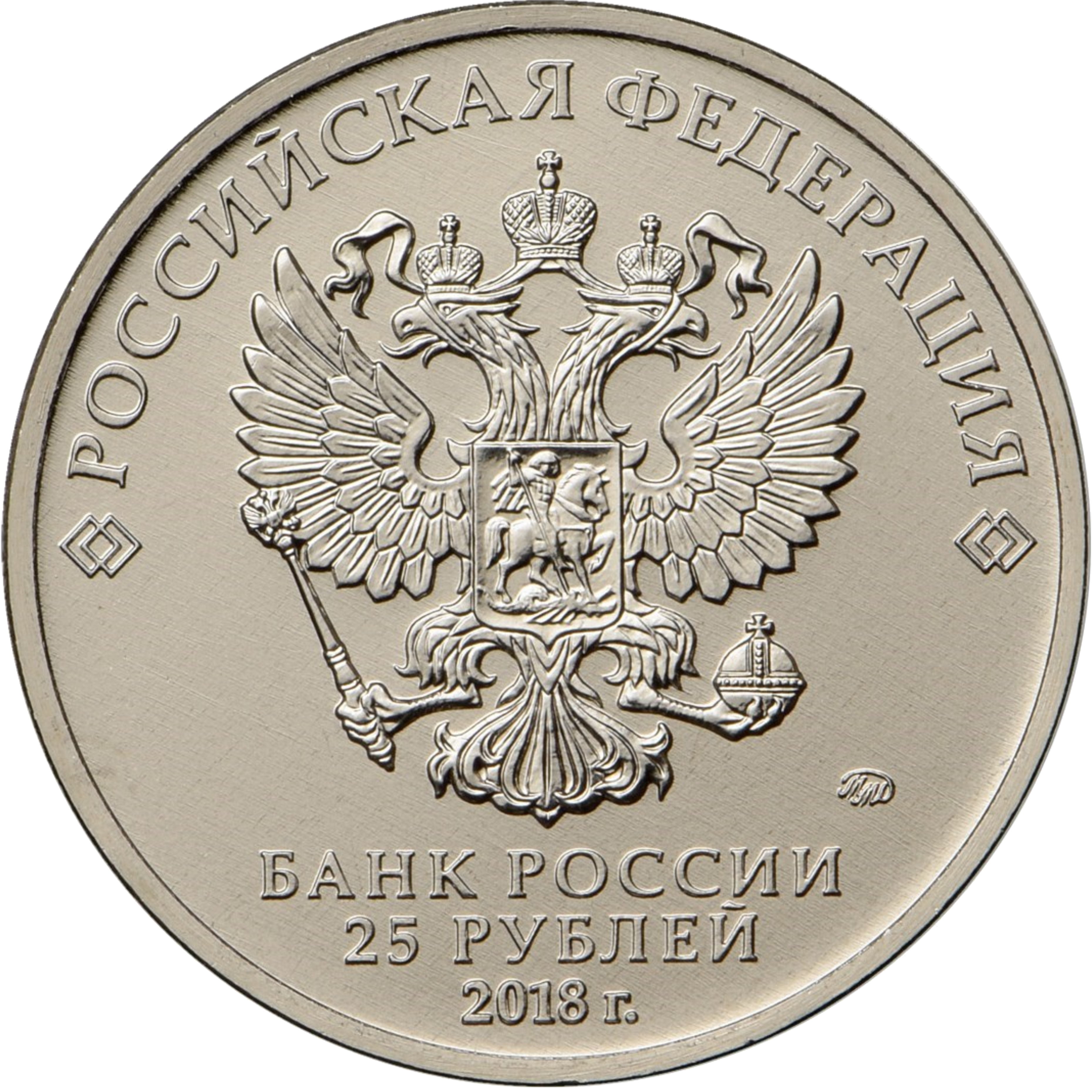 в центре – рельефное изображение Государственного герба Российской Федерации, над ним вдоль канта – надпись полукругом: "РОССИЙСКАЯ ФЕДЕРАЦИЯ", обрамленная с обеих сторон сдвоенными ромбами, внизу под гербом в центре в три строки – надпись: "БАНК РОССИИ", номинал монеты: "25 РУБЛЕЙ", год: "2018 г.", справа – товарный знак монетного двора.