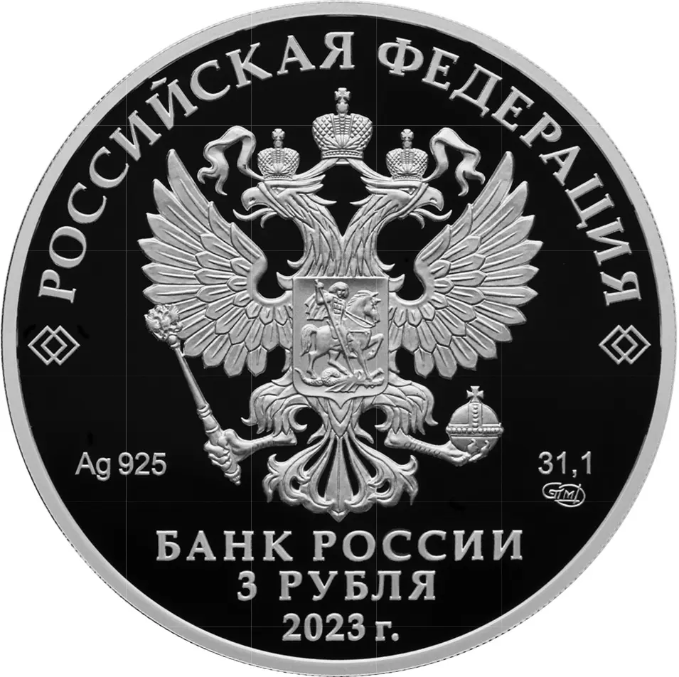 рельефное изображение Государственного герба Российской Федерации, над ним вдоль канта – надпись полукругом «РОССИЙСКАЯ ФЕДЕРАЦИЯ», обрамленная с обеих сторон сдвоенными ромбами, под гербом: слева – обозначения драгоценного металла и пробы сплава, справа – содержание химически чистого металла и товарный знак монетного двора, внизу в центре в три строки – надпись «БАНК РОССИИ», номинал монеты «3 РУБЛЯ», год выпуска «2023 г.».