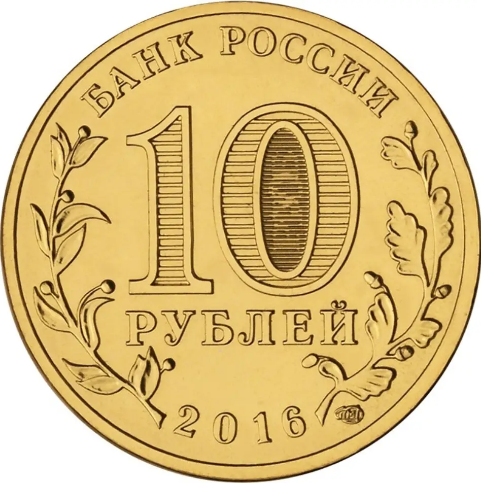 в центре – обозначение номинала монеты: "10 РУБЛЕЙ", внутри цифры "0" – скрытые, видимые поочередно при изменении угла зрения изображения числа "10" и надписи "РУБ", вдоль канта вверху – надпись: "БАНК РОССИИ", внизу – год выпуска "2016", слева – стилизованное изображение лавровой ветви, справа – дубовой, под ней – товарный знак монетного двора.