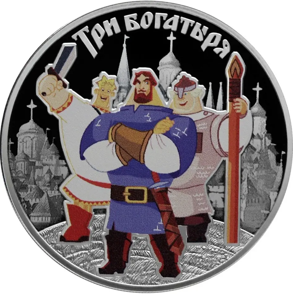 на зеркальном поле диска – цветные изображения героев мультфильма "Три богатыря" на фоне древнего города, вверху вдоль канта – надпись: "ТРИ БОГАТЫРЯ".