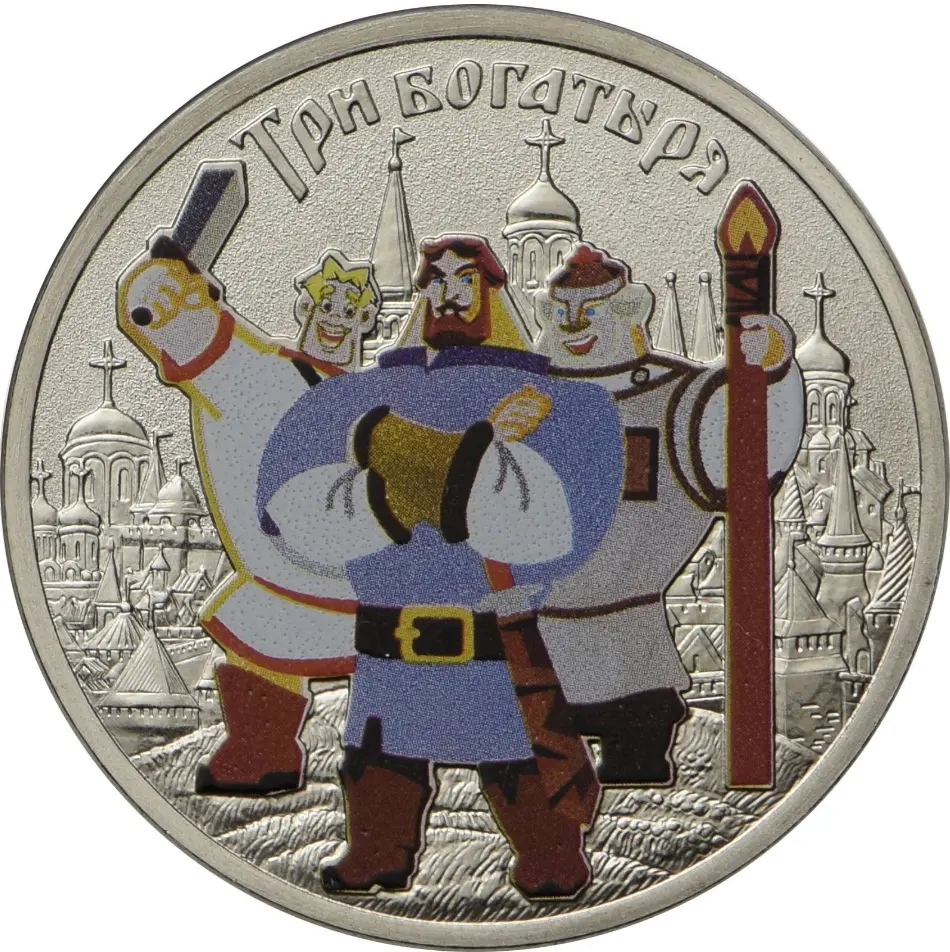 цветные изображения героев мультфильма "Три богатыря" на фоне древнего города, вверху вдоль канта – надпись: "ТРИ БОГАТЫРЯ".