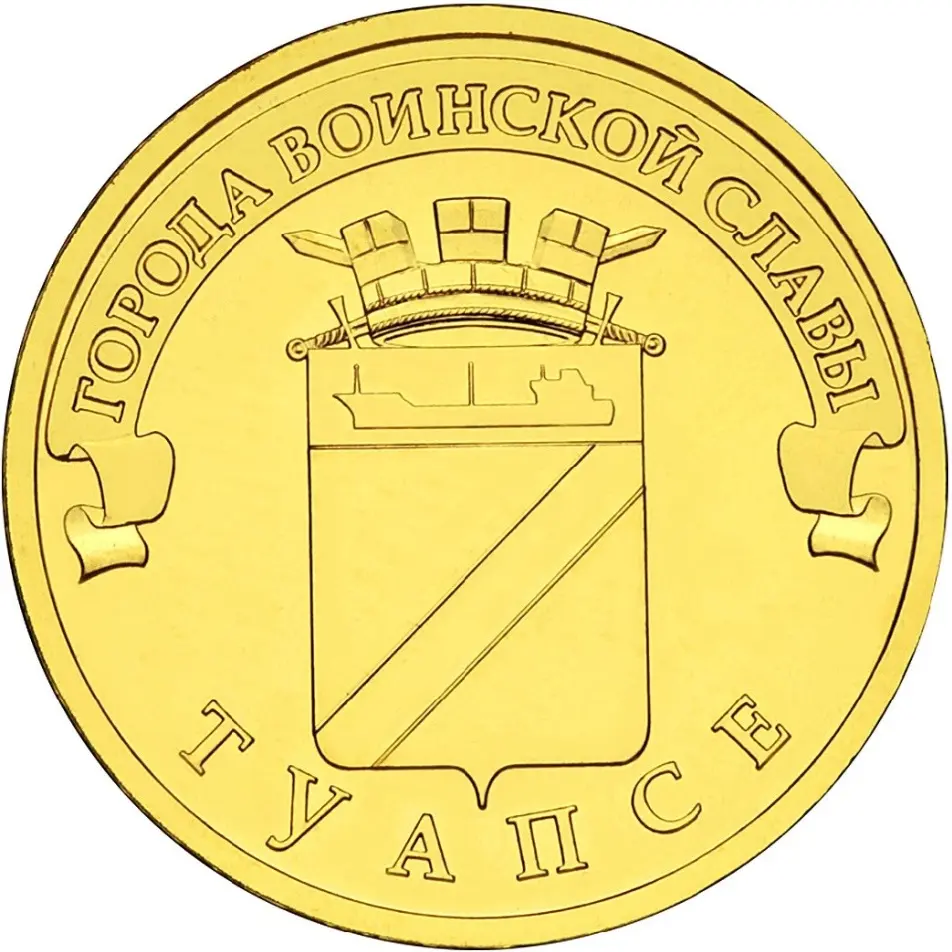 герб города Туапсе, над ним, на ленте - надпись полукругом: "ГОРОДА ВОИНСКОЙ СЛАВЫ", внизу, вдоль канта - надпись: "ТУАПСЕ".