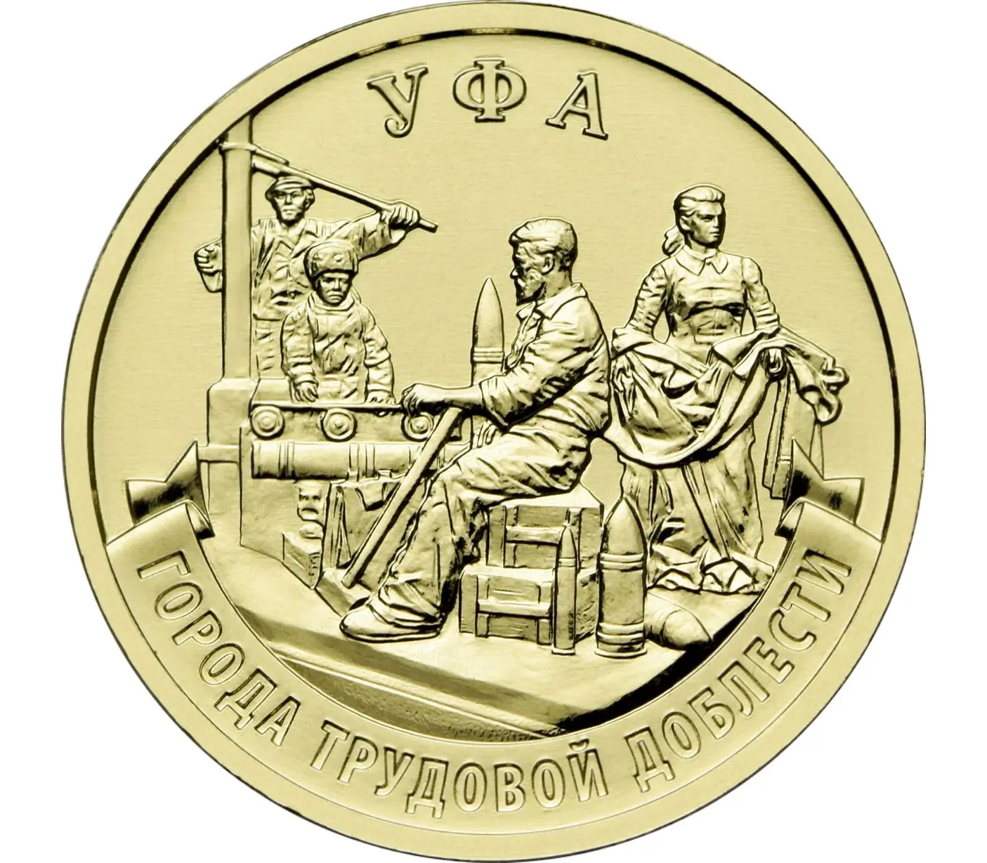 На оборотной стороне монеты (каталожный № 5714-0103) расположено рельефное изображение фрагмента памятника труженикам тыла; по окружности имеются надписи, вверху: «УФА», внизу, на ленте: «ГОРОДА ТРУДОВОЙ ДОБЛЕСТИ»