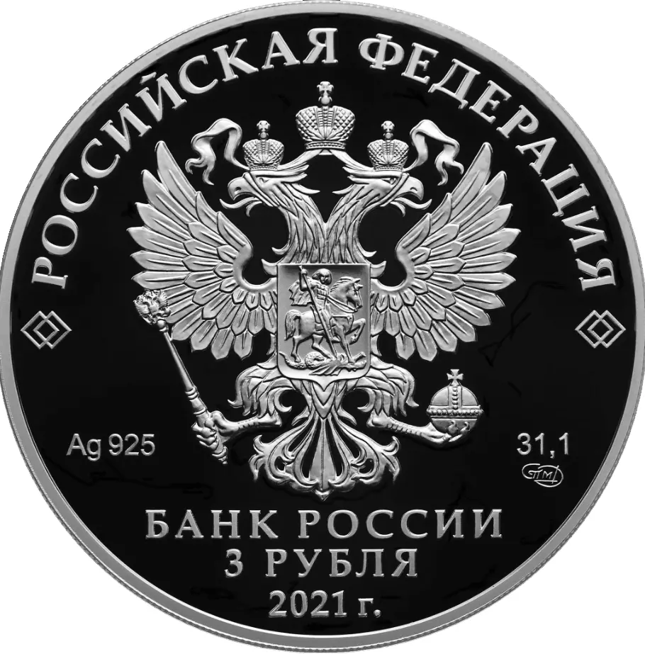 на зеркальном поле диска — рельефное изображение Государственного герба Российской Федерации, над ним вдоль канта — надпись полукругом: «РОССИЙСКАЯ ФЕДЕРАЦИЯ», обрамленная с обеих сторон сдвоенными ромбами, внизу под гербом: слева — обозначения драгоценного металла и пробы сплава, справа — содержание химически чистого металла и товарный знак монетного двора, внизу в центре в три строки — надпись: «БАНК РОССИИ», номинал монеты: «3 РУБЛЯ», год выпуска: «2021 г.».