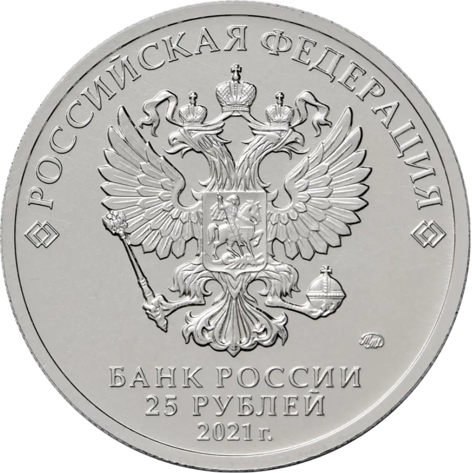 в центре — рельефное изображение Государственного герба Российской Федерации, над ним вдоль канта — надпись полукругом: «РОССИЙСКАЯ ФЕДЕРАЦИЯ», обрамленная с обеих сторон сдвоенными ромбами, под гербом в центре в три строки — надпись: «БАНК РОССИИ», номинал монеты: «25 РУБЛЕЙ», год выпуска: «2021 г.», справа — товарный знак монетного двора.
