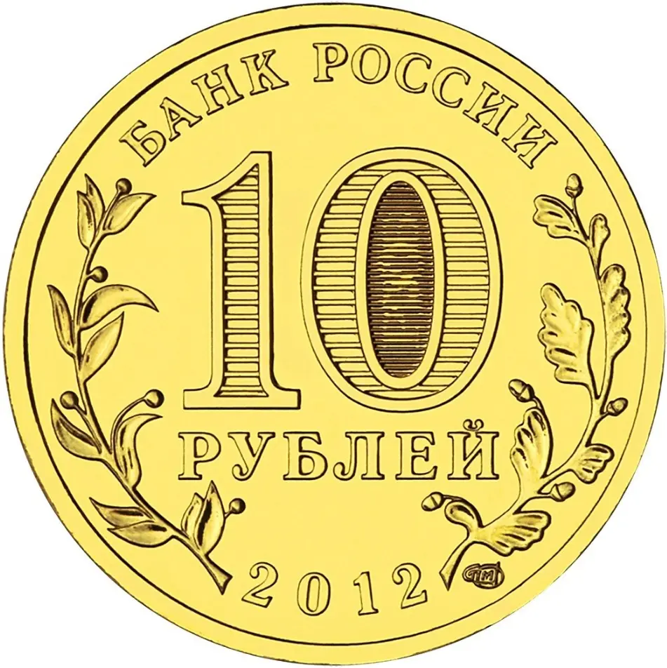 в центре диска - обозначение номинала монеты "10 РУБЛЕЙ". Внутри цифры "0" - скрытые, видимые поочередно при изменении угла зрения изображения цифры "10" и надписи "РУБ". По окружности вдоль канта - надписи, вверху: "БАНК РОССИИ", внизу - дата: "2012", слева - стилизованное изображение лавровой ветви, справа - дубовой.