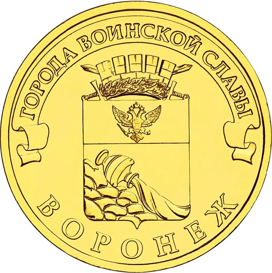 герб города Воронежа, над ним, на ленте - надпись полукругом: "ГОРОДА ВОИНСКОЙ СЛАВЫ", внизу, вдоль канта - надпись: "ВОРОНЕЖ".