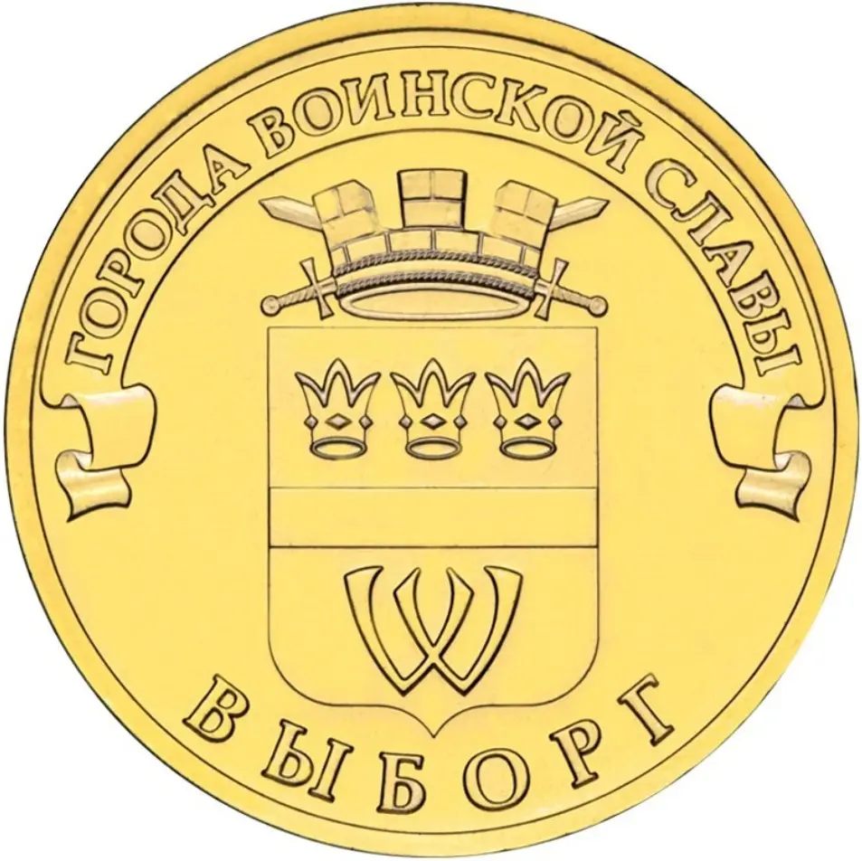 герб города Выборга, над ним, на ленте – надпись полукругом: "ГОРОДА ВОИНСКОЙ СЛАВЫ", внизу вдоль канта – надпись: "ВЫБОРГ".