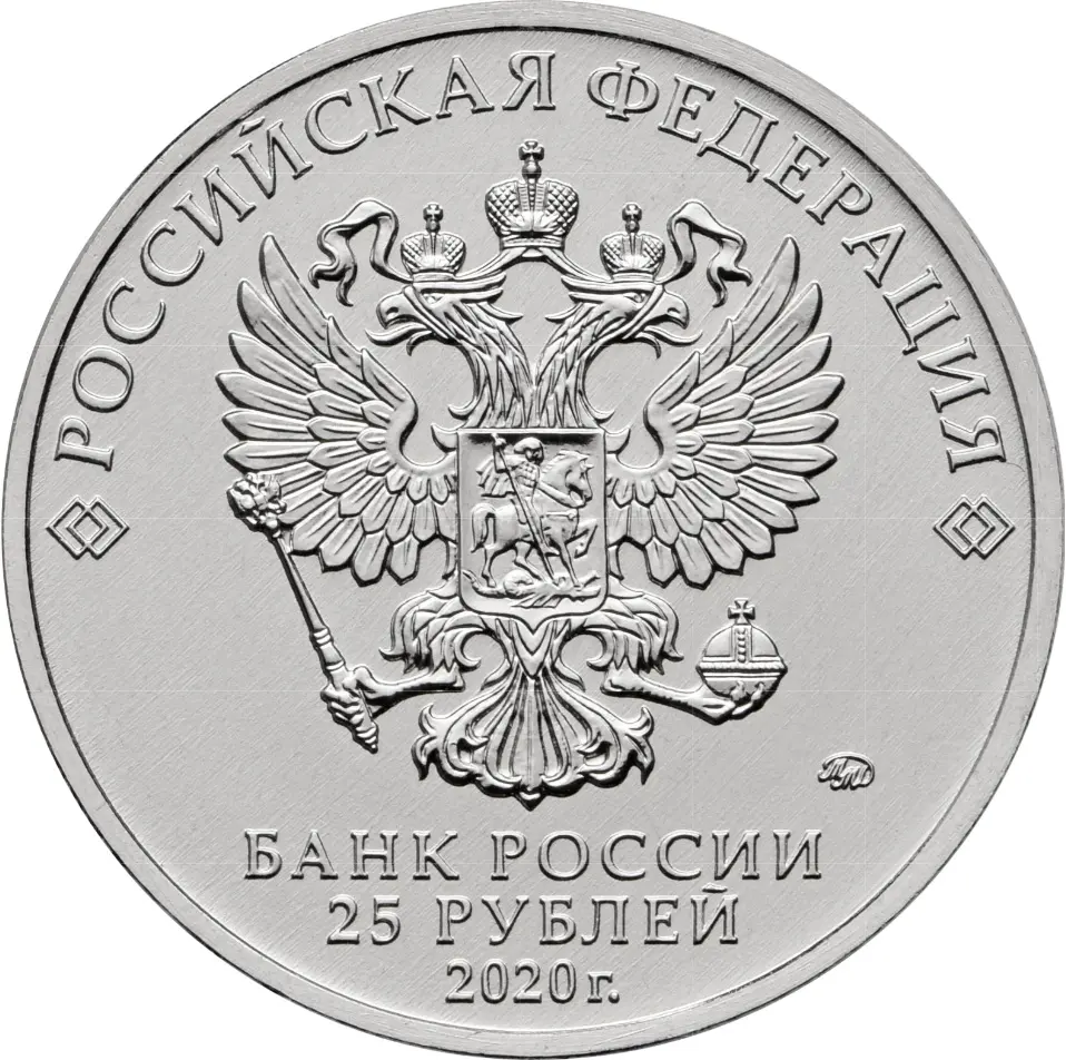в центре – рельефное изображение Государственного герба Российской Федерации, над ним вдоль канта – надпись полукругом: "РОССИЙСКАЯ ФЕДЕРАЦИЯ", обрамленная с обеих сторон сдвоенными ромбами, под гербом в центре в три строки – надпись: "БАНК РОССИИ", номинал монеты: "25 РУБЛЕЙ", год выпуска: "2020 г.", справа – товарный знак монетного двора.