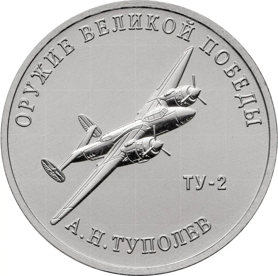 расположено рельефное изображение фронтового бомбардировщика Ту-2, справа – надпись: "ТУ-2"; вдоль канта – надписи, вверху: "ОРУЖИЕ ВЕЛИКОЙ ПОБЕДЫ", внизу: "А.Н. ТУПОЛЕВ".
