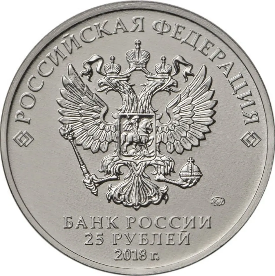 в центре – рельефное изображение Государственного герба Российской Федерации, над ним вдоль канта – надпись полукругом: "РОССИЙСКАЯ ФЕДЕРАЦИЯ", обрамленная с обеих сторон сдвоенными ромбами, под гербом в центре в три строки – надпись: "БАНК РОССИИ", номинал монеты: "25 РУБЛЕЙ", год выпуска: "2018 г.", справа – товарный знак монетного двора.