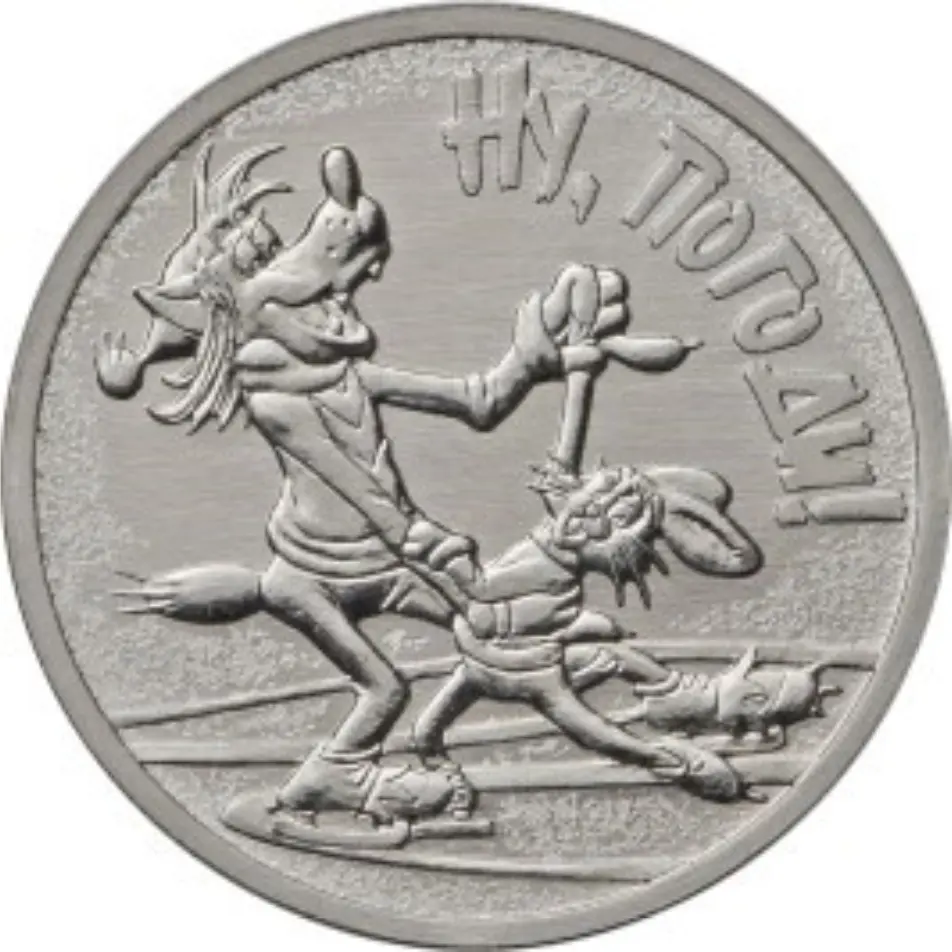 рельефное изображение сцены из мультфильма "Ну, погоди!", справа вверху – надпись: "НУ, ПОГОДИ!".