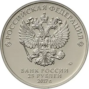 в центре – рельефное изображение Государственного герба Российской Федерации, над ним вдоль канта – надпись полукругом: "РОССИЙСКАЯ ФЕДЕРАЦИЯ", обрамленная с обеих сторон сдвоенными ромбами, под гербом в центре в три строки – надпись: "БАНК РОССИИ", номинал монеты: "25 РУБЛЕЙ", год выпуска: "2017 г.", справа – товарный знак монетного двора.