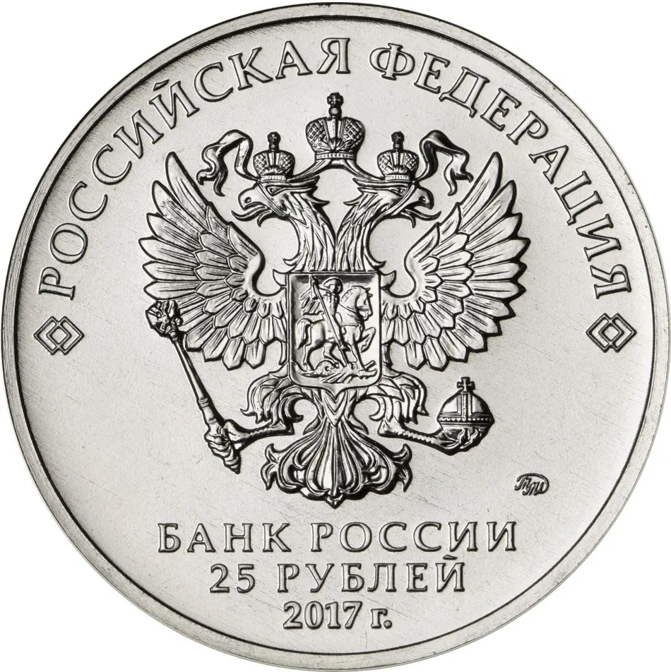в центре – рельефное изображение Государственного герба Российской Федерации, над ним вдоль канта – надпись полукругом: "РОССИЙСКАЯ ФЕДЕРАЦИЯ", обрамленная с обеих сторон сдвоенными ромбами, под гербом в центре в три строки – надпись: "БАНК РОССИИ", номинал монеты: "25 РУБЛЕЙ", год выпуска: "2017 г.", справа – товарный знак монетного двора.