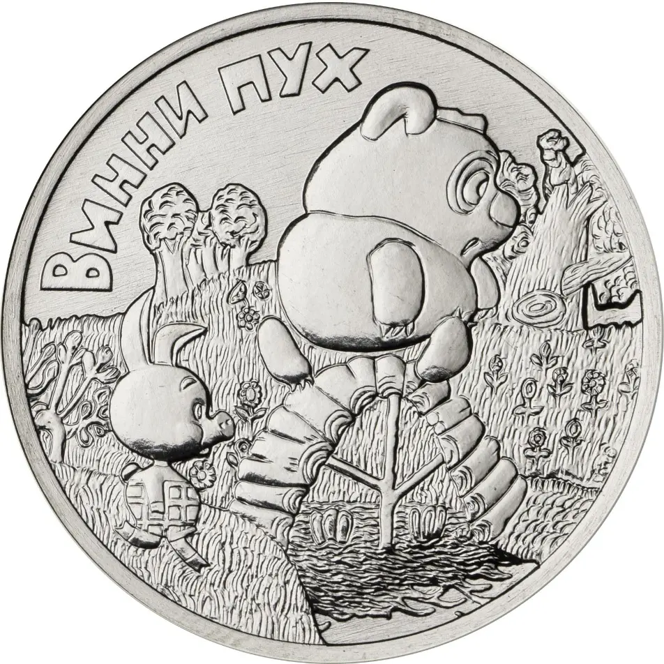 рельефные изображения героев мультфильма "Винни Пух", моста через реку и берега на фоне кустов и деревьев, вверху вдоль канта – надпись: "ВИННИ ПУХ".