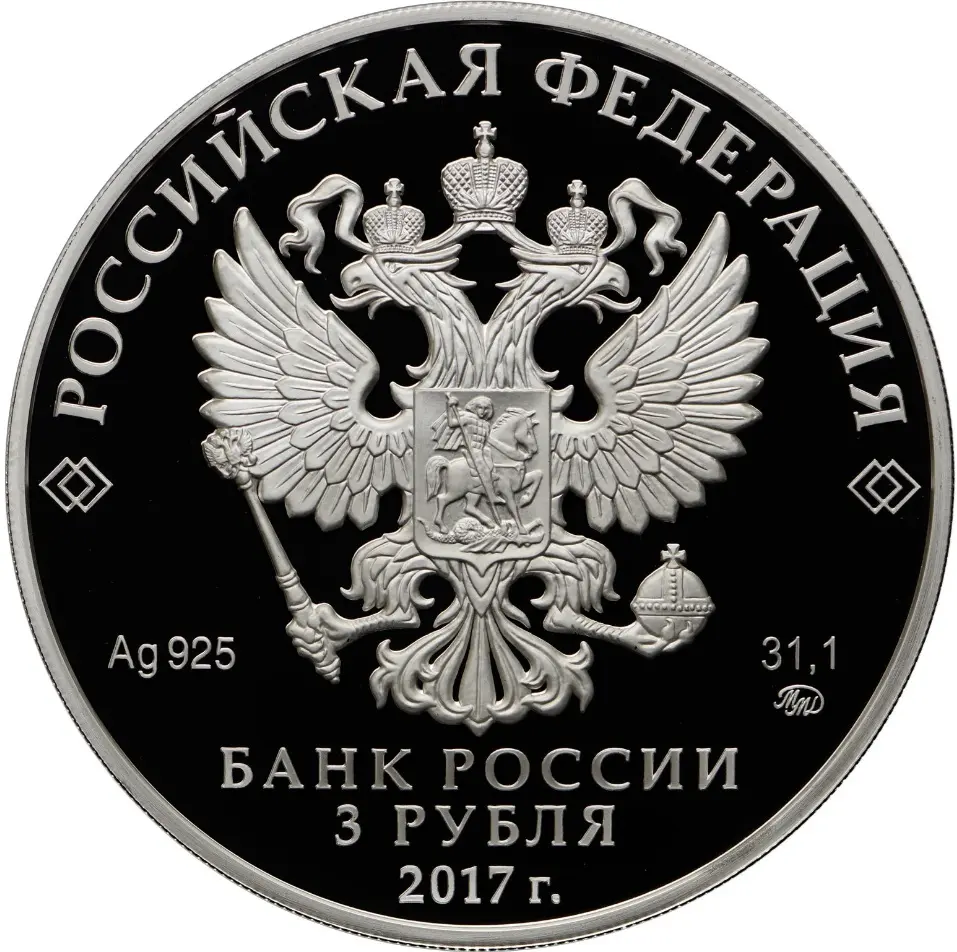 на зеркальном поле диска – рельефное изображение Государственного герба Российской Федерации, над ним вдоль канта – надпись полукругом: "РОССИЙСКАЯ ФЕДЕРАЦИЯ", обрамленная с обеих сторон сдвоенными ромбами, внизу под гербом: слева – обозначения драгоценного металла и пробы сплава, справа – содержание химически чистого металла и товарный знак монетного двора, внизу в центре в три строки – надпись: "БАНК РОССИИ", номинал монеты: "3 РУБЛЯ", год выпуска: "2017 г.".