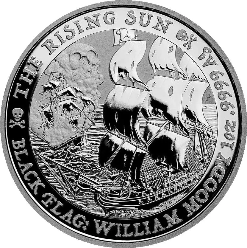 Эта эффектная серебряная монета массой 5 унций стала четвёртым выпуском серии «Чёрный флаг» от Пертский монетный двор и посвящена кораблю «Восходящее солнце», которым командовал Уильям Муди. Тираж выпуска составляет 15 000 экземпляров.