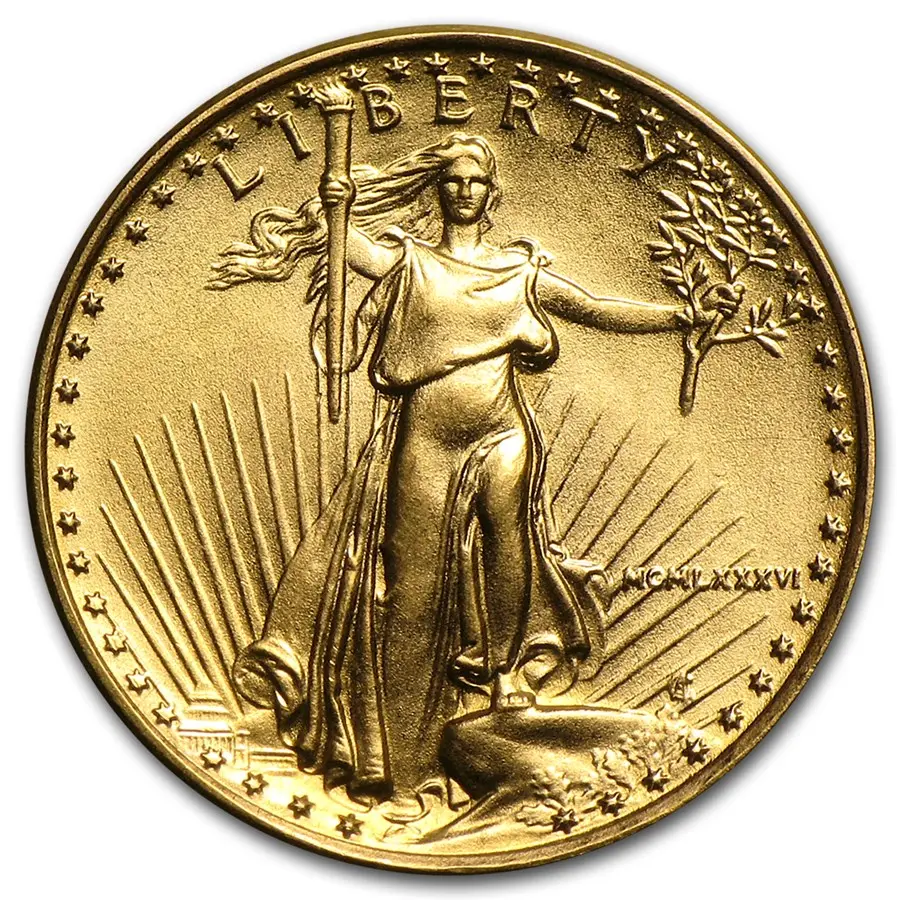 Аверс инвестиционной монеты «Американский золотой орёл» (American Gold Eagle) украшен величественным изображением аллегорической фигуры Свободы (Liberty), созданной по мотивам классического дизайна Августа Сен-Годенса 1907 года. Женщина изображена в полный рост, с развевающимися волосами; в правой руке она держит факел символ просвещения, в левой оливковую ветвь, олицетворяющую мир. Фигура Свободы возвышается на фоне расходящихся солнечных лучей и здания Капитолия, символизирующего американское правительство и принципы демократии. По краю монеты выгравированы 50 звёзд, отражающих количество штатов, а также надпись «LIBERTY»; справа указан год чеканки 1986 римскими цифрами, позднее арабскими). Этот дизайн, сочетающий мощь и гармонию, воплощает ключевые ценности США свободу, мир и силу.