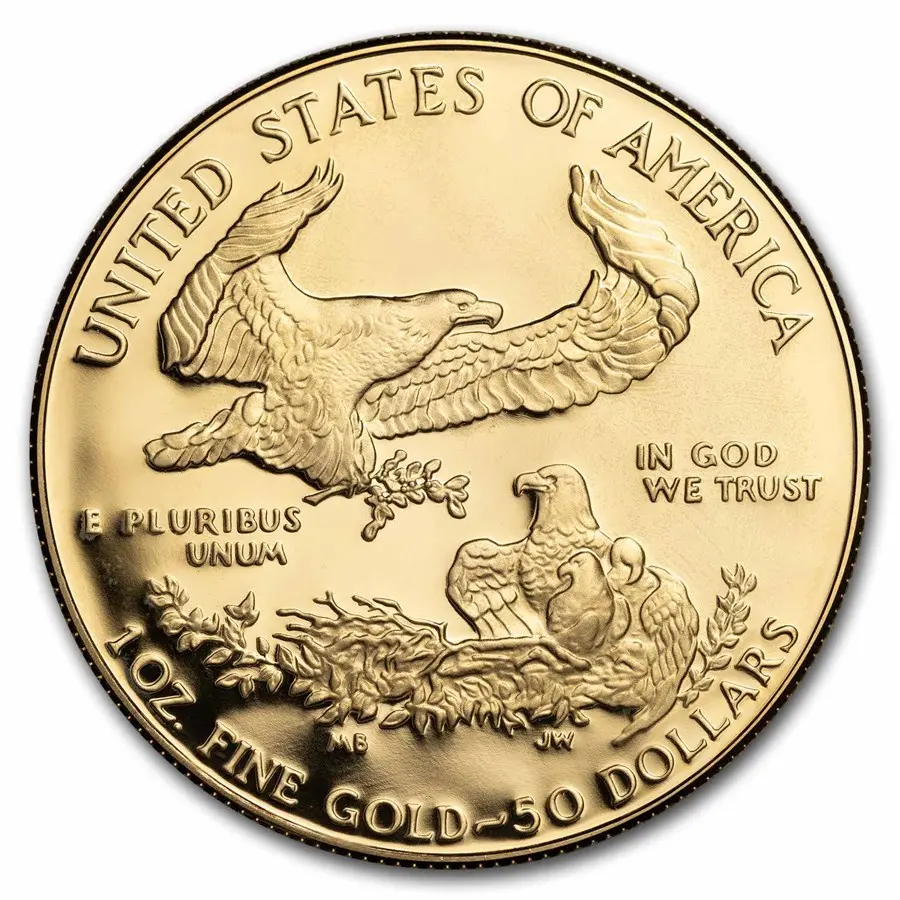 Реверс инвестиционной монеты «Американский золотой орёл» (American Gold Eagle) поражает величественным изображением белоголового орлана национального символа США: в верхней части композиции парящая птица с распростёртыми крыльями словно оберегает страну, а внизу орёл с орлятами в гнезде, окружённый ветвями, символизирует заботу, продолжение рода и силу традиций. Вокруг центрального изображения выгравированы ключевые элементы: надпись «UNITED STATES OF AMERICA» в верхней части, девизы «E PLURIBUS UNUM» (в левом нижнем углу) и «IN GOD WE TRUST» (в правом верхнем), а также указания на вес (1 oz fine gold), номинал (50 долларов) и инициалы мастеров-граверов (MB, JW), что подчёркивает сочетание патриотизма, духовности и высокого уровня ювелирного искусства.