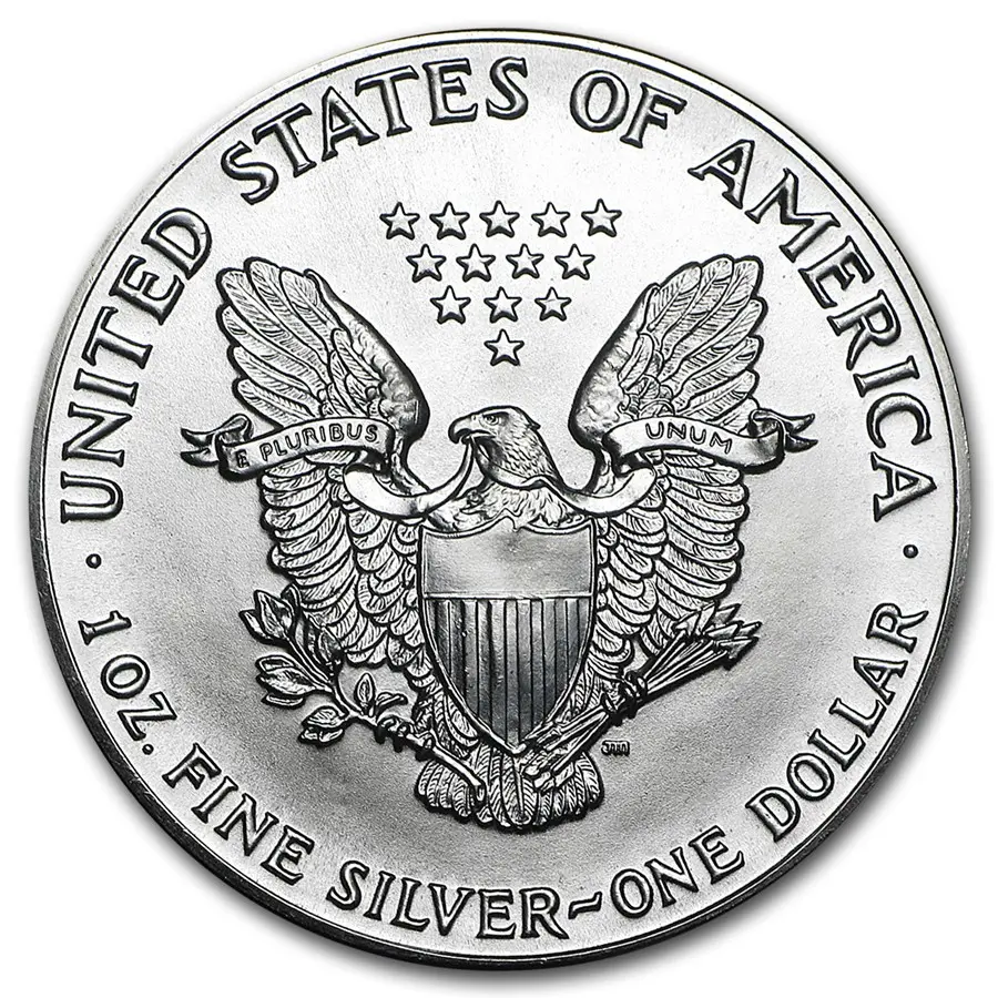 По кругу выгравированы слова «UNITED STATES OF AMERICA», а внизу — указание на содержание драгоценного металла: «1 OZ. FINE SILVER» (одна унция чистого серебра) и номинал «ONE DOLLAR».