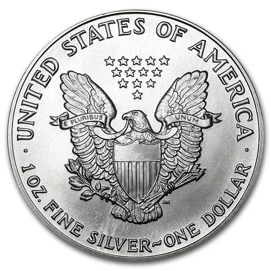 На реверсе монеты «American Silver Eagle» величественно возвышается белоголовый орлан — символ силы, свободы и независимости Соединённых Штатов Америки. Его могучие крылья широко раскинуты, словно он готов взмыть в небо, охраняя просторы страны. В когтях орлан держит пучок стрел — символ готовности защищать родину, и оливковую ветвь, олицетворяющую стремление к миру.