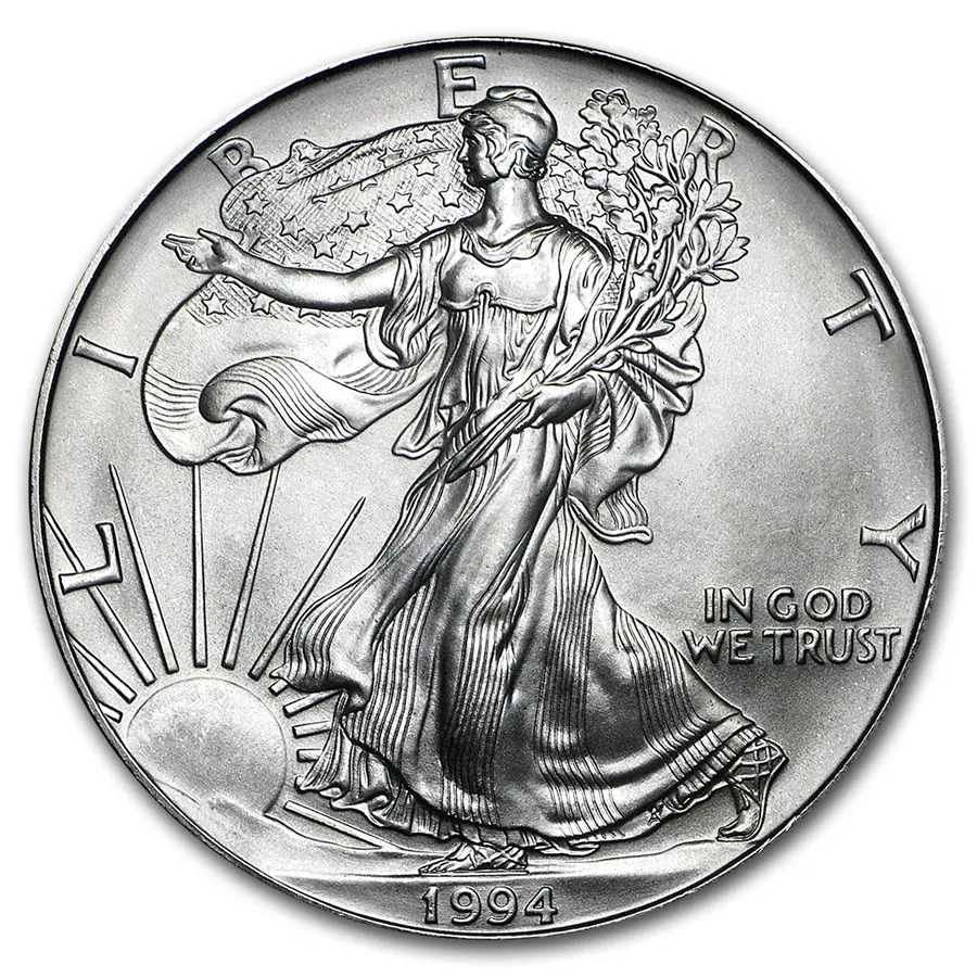 Вдоль верхнего края монеты выгравировано слово «LIBERTY» (Свобода), а справа красуется надпись «IN GOD WE TRUST» («На Бога уповаем») — национальный девиз США. В нижней части указан год выпуска — 1994. Этот аверс — не просто изображение, а целая история о ценностях, которые бережёт Америка: свободе, мире, силе и вере.