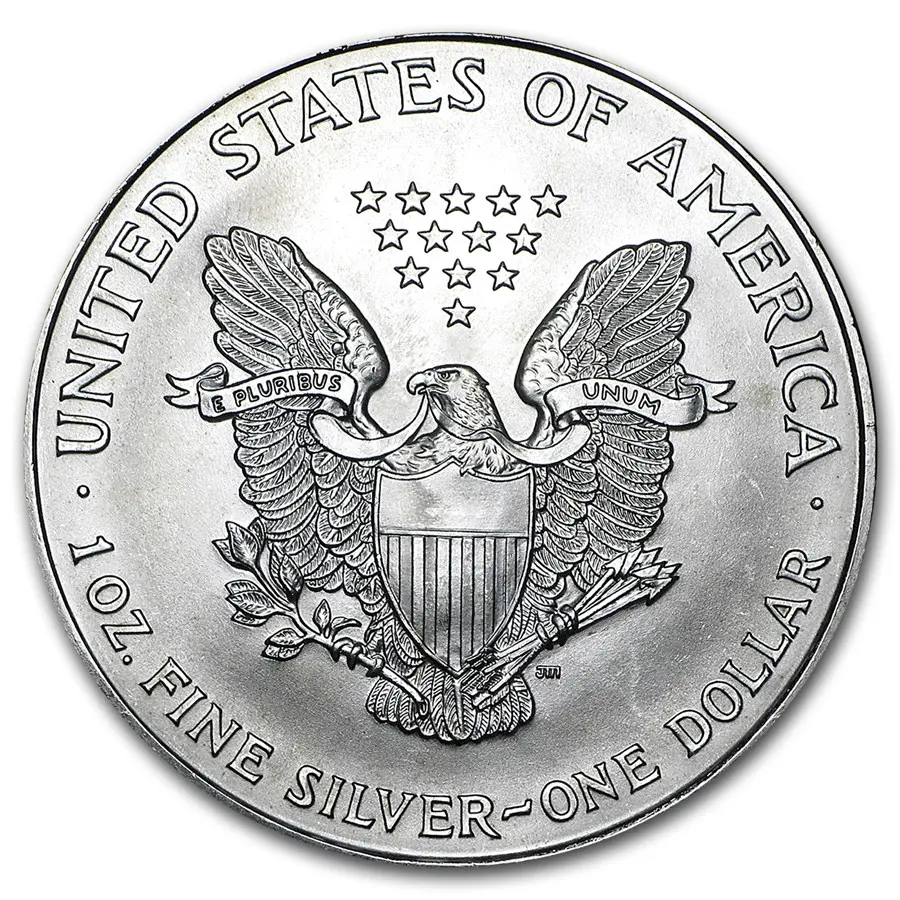 На реверсе монеты «American Silver Eagle» величественно возвышается белоголовый орлан — символ силы, свободы и независимости Соединённых Штатов Америки. Его могучие крылья широко раскинуты, словно он готов взмыть в небо, охраняя просторы страны. В когтях орлан держит пучок стрел — символ готовности защищать родину, и оливковую ветвь, олицетворяющую стремление к миру.