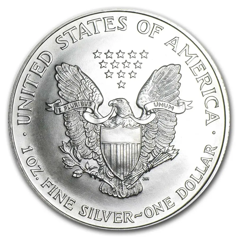 По кругу выгравированы слова «UNITED STATES OF AMERICA», а внизу — указание на содержание драгоценного металла: «1 OZ. FINE SILVER» (одна унция чистого серебра) и номинал «ONE DOLLAR».