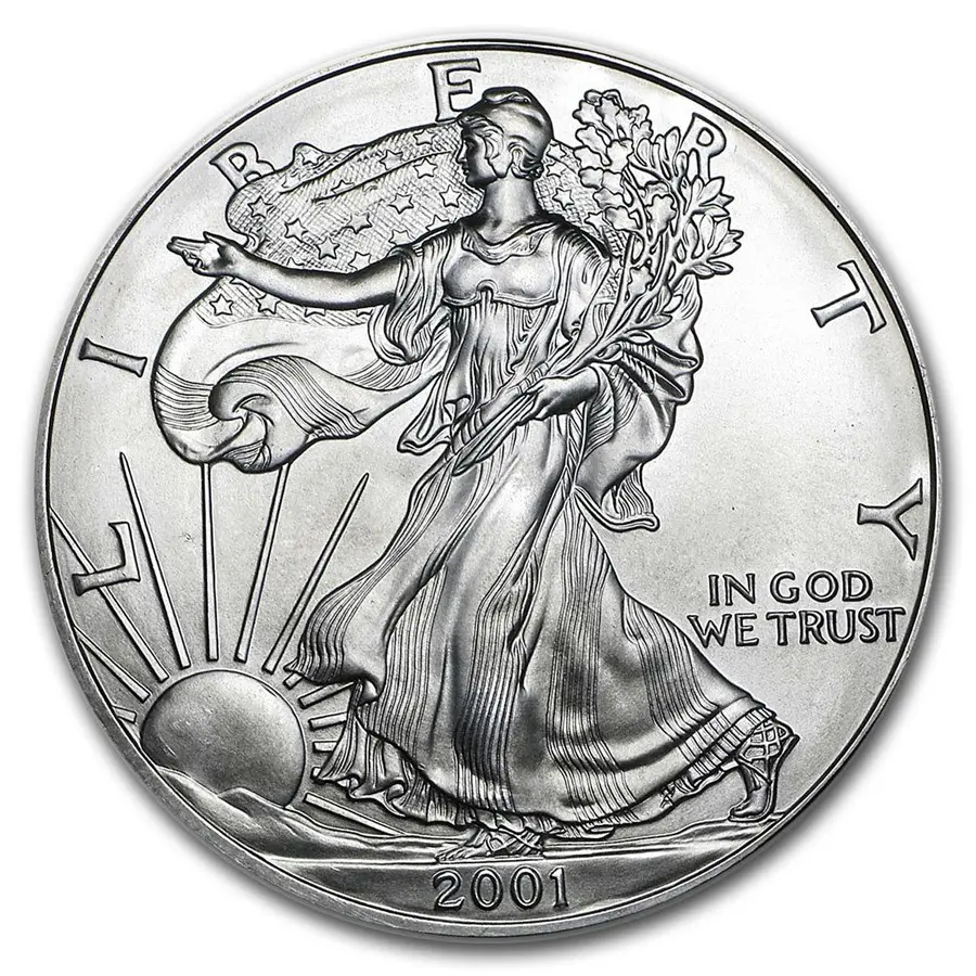Вдоль верхнего края монеты выгравировано слово «LIBERTY» (Свобода), а справа красуется надпись «IN GOD WE TRUST» («На Бога уповаем») — национальный девиз США. В нижней части указан год выпуска — 2001. Этот аверс — не просто изображение, а целая история о ценностях, которые бережёт Америка: свободе, мире, силе и вере.