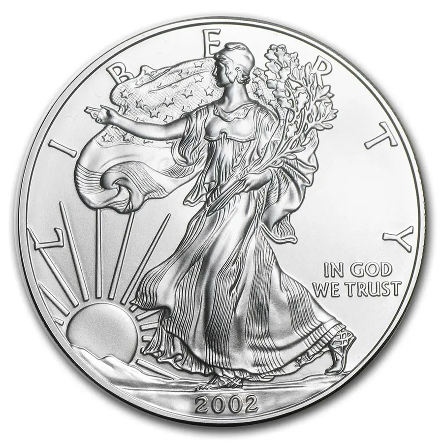 Вдоль верхнего края монеты выгравировано слово «LIBERTY» (Свобода), а справа красуется надпись «IN GOD WE TRUST» («На Бога уповаем») — национальный девиз США. В нижней части указан год выпуска — 2002. Этот аверс — не просто изображение, а целая история о ценностях, которые бережёт Америка: свободе, мире, силе и вере.