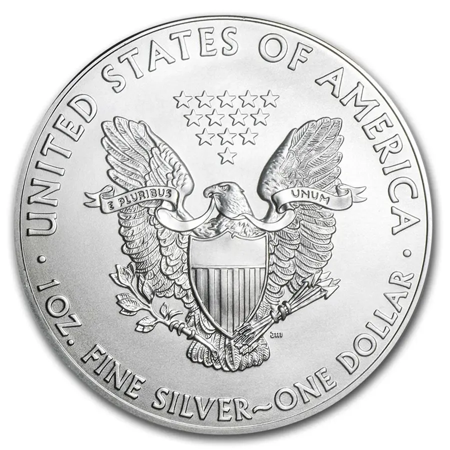 На реверсе монеты «American Silver Eagle» величественно возвышается белоголовый орлан — символ силы, свободы и независимости Соединённых Штатов Америки. Его могучие крылья широко раскинуты, словно он готов взмыть в небо, охраняя просторы страны. В когтях орлан держит пучок стрел — символ готовности защищать родину, и оливковую ветвь, олицетворяющую стремление к миру.