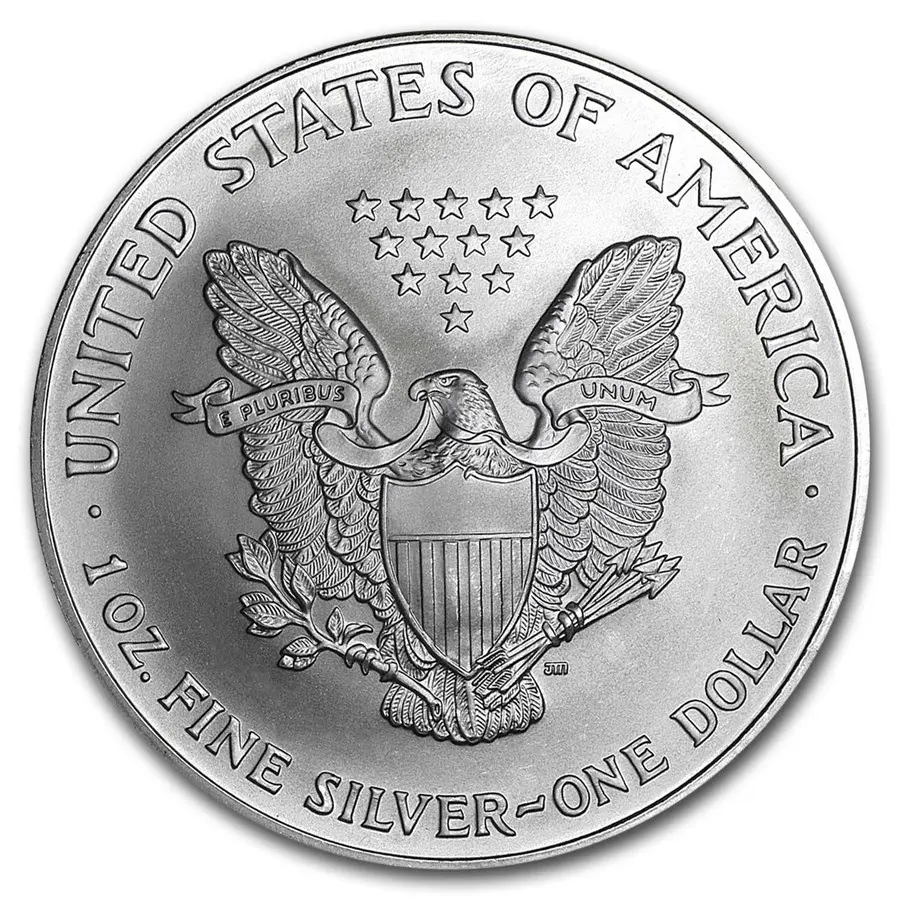 На реверсе монеты «American Silver Eagle» величественно возвышается белоголовый орлан — символ силы, свободы и независимости Соединённых Штатов Америки. Его могучие крылья широко раскинуты, словно он готов взмыть в небо, охраняя просторы страны. В когтях орлан держит пучок стрел — символ готовности защищать родину, и оливковую ветвь, олицетворяющую стремление к миру.