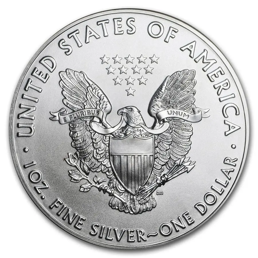 На реверсе монеты «American Silver Eagle» величественно возвышается белоголовый орлан — символ силы, свободы и независимости Соединённых Штатов Америки. Его могучие крылья широко раскинуты, словно он готов взмыть в небо, охраняя просторы страны. В когтях орлан держит пучок стрел — символ готовности защищать родину, и оливковую ветвь, олицетворяющую стремление к миру.