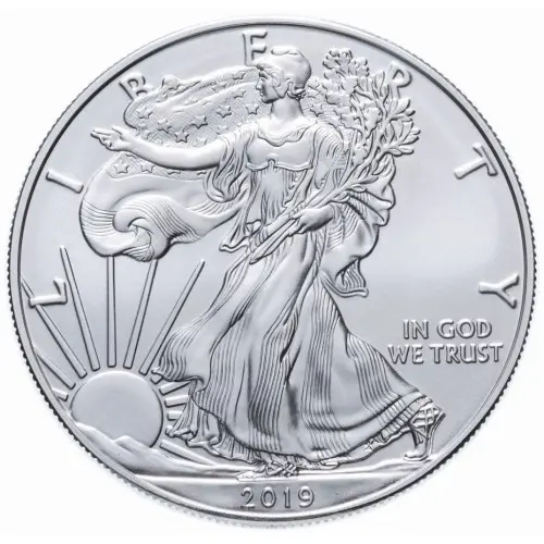 Вдоль верхнего края монеты выгравировано слово «LIBERTY» (Свобода), а справа красуется надпись «IN GOD WE TRUST» («На Бога уповаем») — национальный девиз США. В нижней части указан год выпуска — 2019. Этот реверс — не просто изображение, а целая история о ценностях, которые бережёт Америка: свободе, мире, силе и вере.