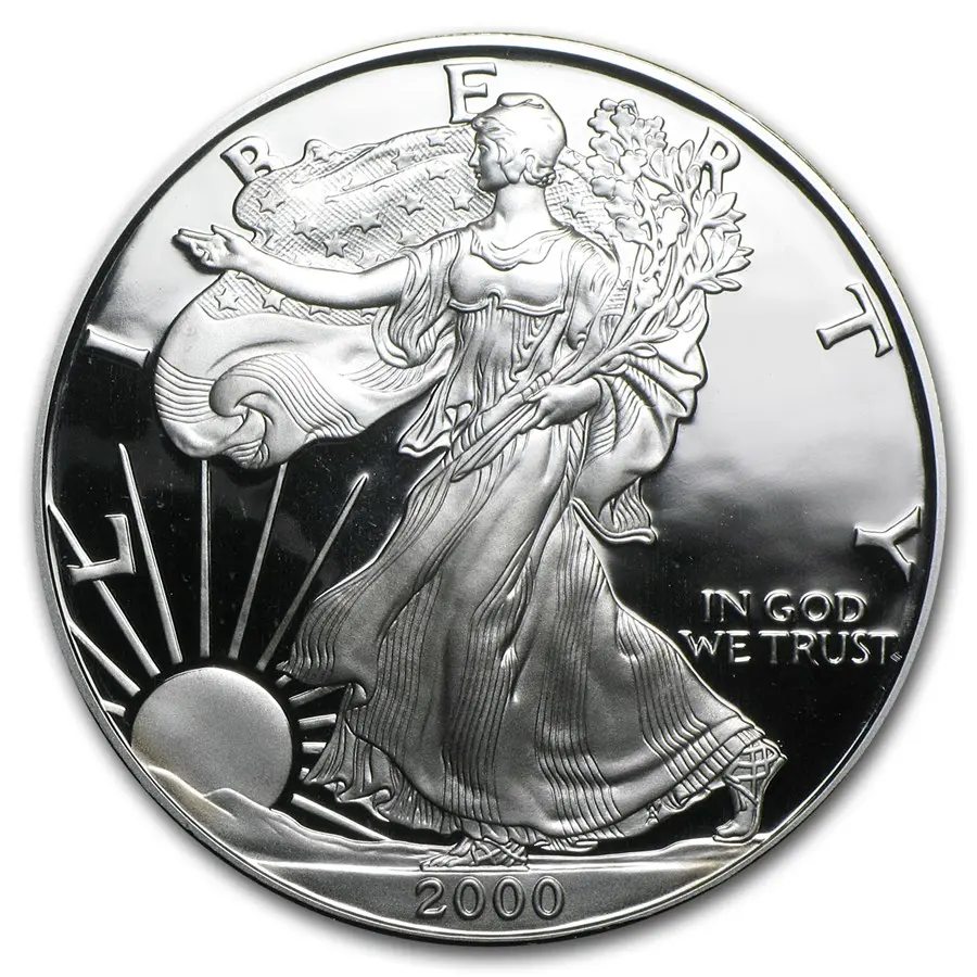 На аверсе монеты изображена аллегорическая фигура Свободы (Liberty) в развевающихся одеждах, шагающая вперёд с распростёртой рукой. В левой руке она держит пучок стрел и оливковую ветвь — символы готовности к защите и стремления к миру. За спиной Свободы — развевающийся плащ с изображением звёзд, а слева восходит солнце, символизирующее надежду и новое начало. В верхней части монеты выгравировано слово «LIBERTY», справа — девиз «IN GOD WE TRUST», а в нижней части указан год выпуска — 2000. Композиция воплощает идеалы свободы, силы и веры.