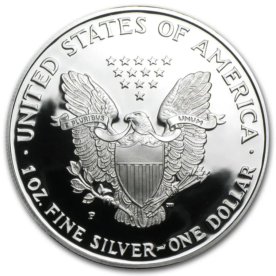 На реверсе монеты величественно возвышается белоголовый орлан — государственный символ США: с распростёртыми крыльями он оберегает щит с 13 полосами, символизирующими первые штаты. В лапах орлан держит оливковую ветвь (символ мира) и пучок стрел (готовность к защите), а в клюве — ленту с девизом «E PLURIBUS UNUM» («Из многих — единое»). Над птицей сияет созвездие из 13 звёзд, олицетворяющее единство колоний. По кругу выгравированы надписи: «UNITED STATES OF AMERICA», «1 OZ. FINE SILVER — ONE DOLLAR», а также знак монетного двора («P»). Композиция воплощает силу, единство и идеалы страны.