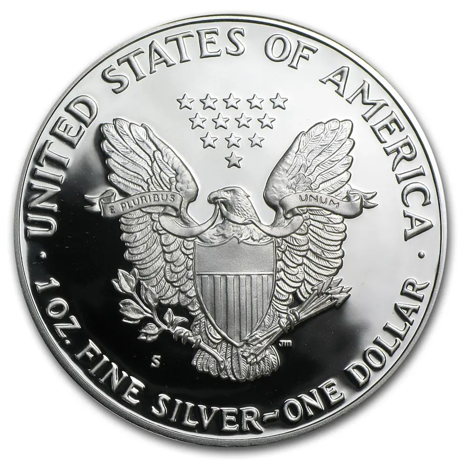 На реверсе монеты величественно возвышается белоголовый орлан — государственный символ США: с распростёртыми крыльями он оберегает щит с 13 полосами, символизирующими первые штаты. В лапах орлан держит оливковую ветвь (символ мира) и пучок стрел (готовность к защите), а в клюве — ленту с девизом «E PLURIBUS UNUM» («Из многих — единое»). Над птицей сияет созвездие из 13 звёзд, олицетворяющее единство колоний. По кругу выгравированы надписи: «UNITED STATES OF AMERICA», «1 OZ. FINE SILVER — ONE DOLLAR», а также знак монетного двора («S»). Композиция воплощает силу, единство и идеалы страны.