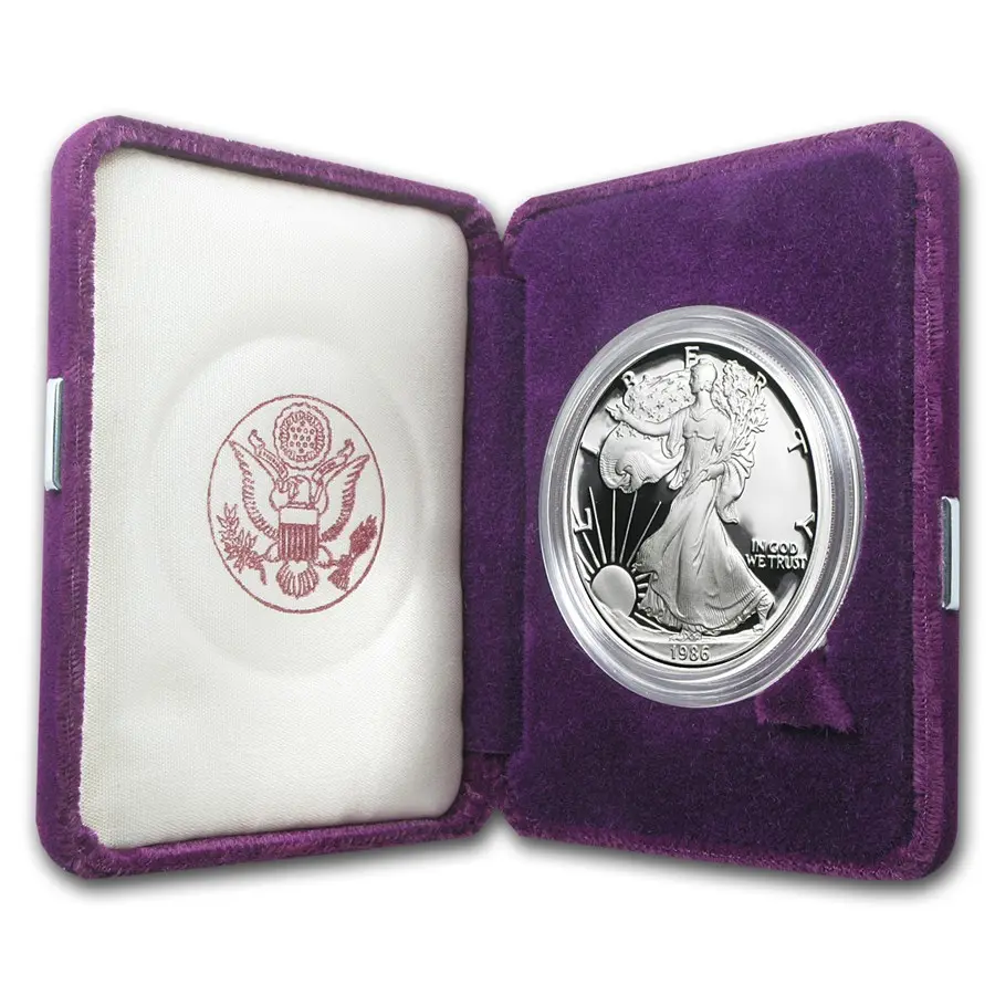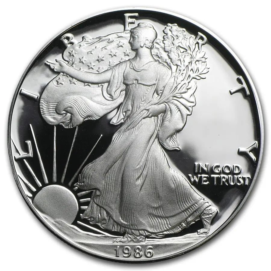 На аверсе монеты изображена аллегорическая фигура Свободы (Liberty) в развевающихся одеждах, шагающая вперёд с распростёртой рукой. В левой руке она держит пучок стрел и оливковую ветвь — символы готовности к защите и стремления к миру. За спиной Свободы — развевающийся плащ с изображением звёзд, а слева восходит солнце, символизирующее надежду и новое начало. В верхней части монеты выгравировано слово «LIBERTY», справа — девиз «IN GOD WE TRUST», а в нижней части указан год выпуска — 1986. Композиция воплощает идеалы свободы, силы и веры.