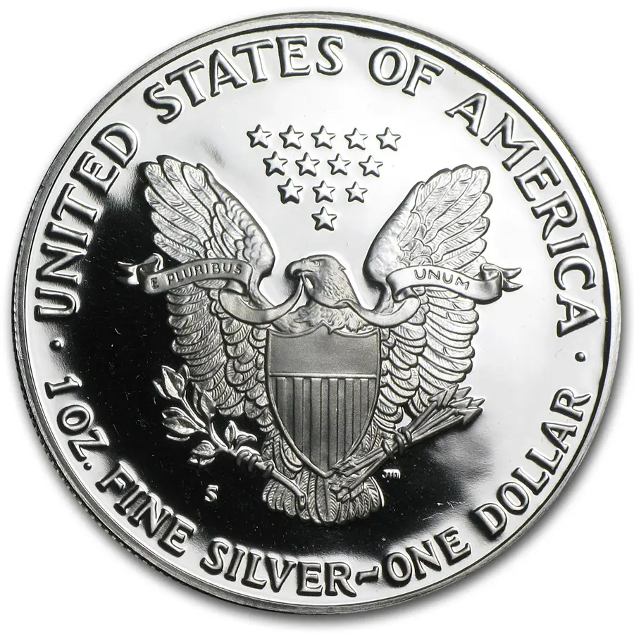 На реверсе монеты величественно возвышается белоголовый орлан — государственный символ США: с распростёртыми крыльями он оберегает щит с 13 полосами, символизирующими первые штаты. В лапах орлан держит оливковую ветвь (символ мира) и пучок стрел (готовность к защите), а в клюве — ленту с девизом «E PLURIBUS UNUM» («Из многих — единое»). Над птицей сияет созвездие из 13 звёзд, олицетворяющее единство колоний. По кругу выгравированы надписи: «UNITED STATES OF AMERICA», «1 OZ. FINE SILVER — ONE DOLLAR», а также знак монетного двора («S»). Композиция воплощает силу, единство и идеалы страны.