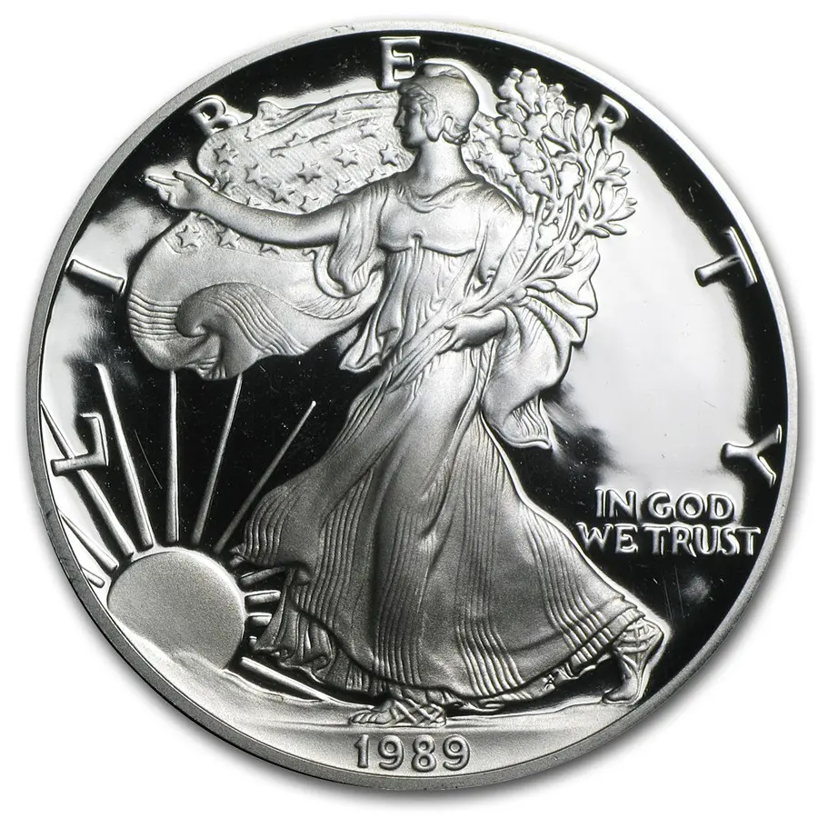 На аверсе монеты изображена аллегорическая фигура Свободы (Liberty) в развевающихся одеждах, шагающая вперёд с распростёртой рукой. В левой руке она держит пучок стрел и оливковую ветвь — символы готовности к защите и стремления к миру. За спиной Свободы — развевающийся плащ с изображением звёзд, а слева восходит солнце, символизирующее надежду и новое начало. В верхней части монеты выгравировано слово «LIBERTY», справа — девиз «IN GOD WE TRUST», а в нижней части указан год выпуска — 1989. Композиция воплощает идеалы свободы, силы и веры.