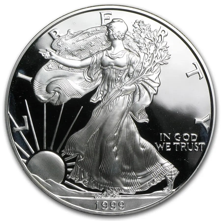 На аверсе монеты изображена аллегорическая фигура Свободы (Liberty) в развевающихся одеждах, шагающая вперёд с распростёртой рукой. В левой руке она держит пучок стрел и оливковую ветвь — символы готовности к защите и стремления к миру. За спиной Свободы — развевающийся плащ с изображением звёзд, а слева восходит солнце, символизирующее надежду и новое начало. В верхней части монеты выгравировано слово «LIBERTY», справа — девиз «IN GOD WE TRUST», а в нижней части указан год выпуска — 1999. Композиция воплощает идеалы свободы, силы и веры.