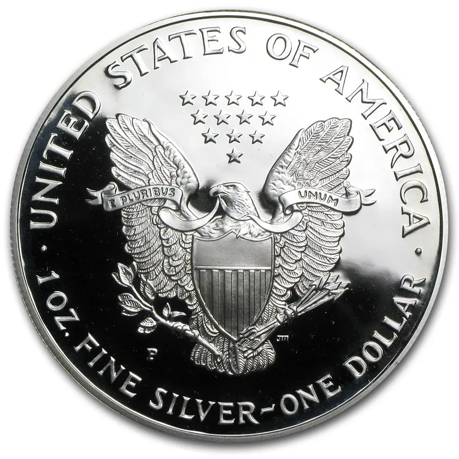 На реверсе монеты величественно возвышается белоголовый орлан — государственный символ США: с распростёртыми крыльями он оберегает щит с 13 полосами, символизирующими первые штаты. В лапах орлан держит оливковую ветвь (символ мира) и пучок стрел (готовность к защите), а в клюве — ленту с девизом «E PLURIBUS UNUM» («Из многих — единое»). Над птицей сияет созвездие из 13 звёзд, олицетворяющее единство колоний. По кругу выгравированы надписи: «UNITED STATES OF AMERICA», «1 OZ. FINE SILVER — ONE DOLLAR», а также знак монетного двора («S»). Композиция воплощает силу, единство и идеалы страны.