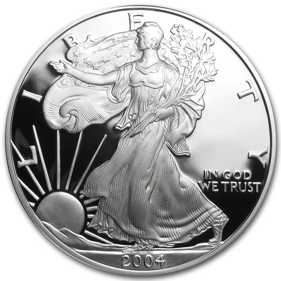 На аверсе монеты изображена аллегорическая фигура Свободы (Liberty) в развевающихся одеждах, шагающая вперёд с распростёртой рукой. В левой руке она держит пучок стрел и оливковую ветвь — символы готовности к защите и стремления к миру. За спиной Свободы — развевающийся плащ с изображением звёзд, а слева восходит солнце, символизирующее надежду и новое начало. В верхней части монеты выгравировано слово «LIBERTY», справа — девиз «IN GOD WE TRUST», а в нижней части указан год выпуска — 2004. Композиция воплощает идеалы свободы, силы и веры.
