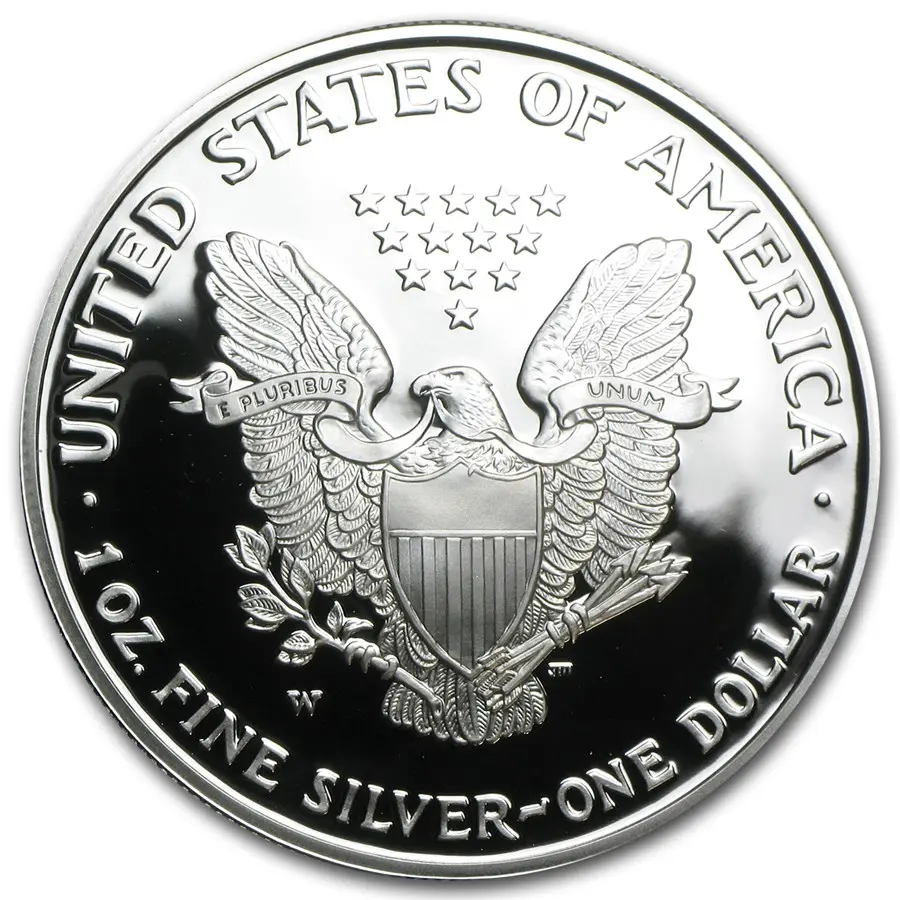 На реверсе монеты величественно возвышается белоголовый орлан — государственный символ США: с распростёртыми крыльями он оберегает щит с 13 полосами, символизирующими первые штаты. В лапах орлан держит оливковую ветвь (символ мира) и пучок стрел (готовность к защите), а в клюве — ленту с девизом «E PLURIBUS UNUM» («Из многих — единое»). Над птицей сияет созвездие из 13 звёзд, олицетворяющее единство колоний. По кругу выгравированы надписи: «UNITED STATES OF AMERICA», «1 OZ. FINE SILVER — ONE DOLLAR», а также знак монетного двора («S»). Композиция воплощает силу, единство и идеалы страны.